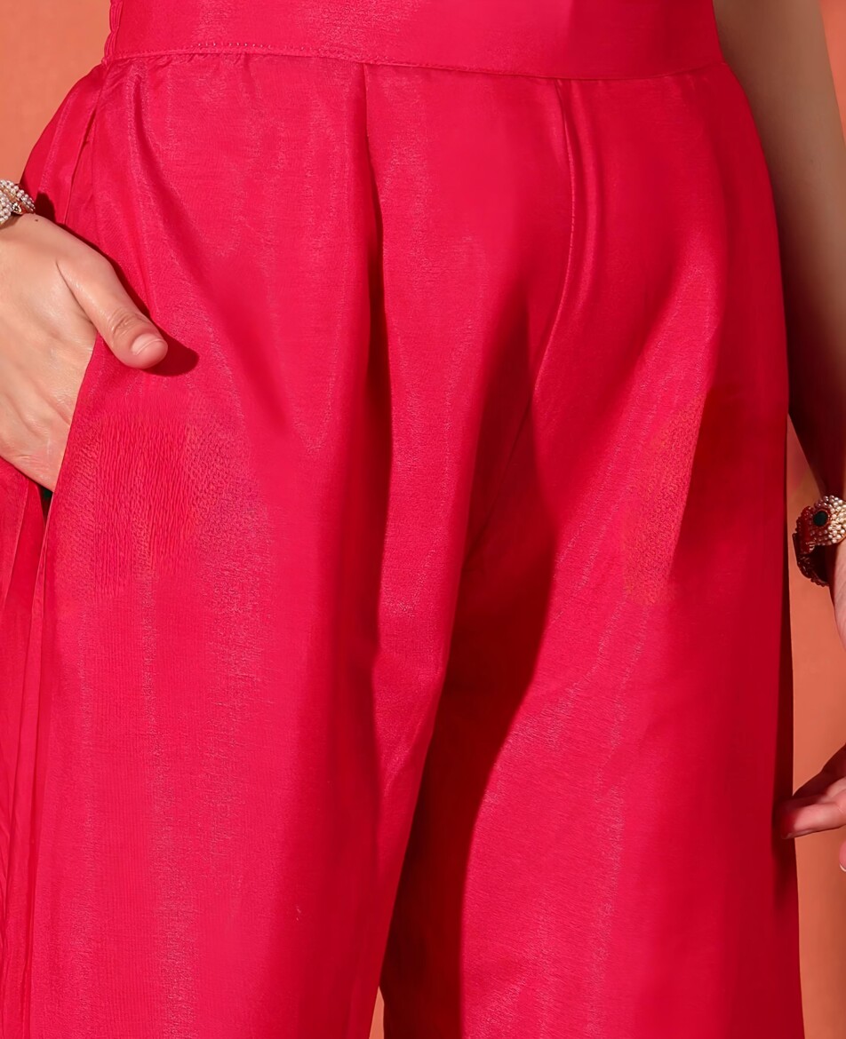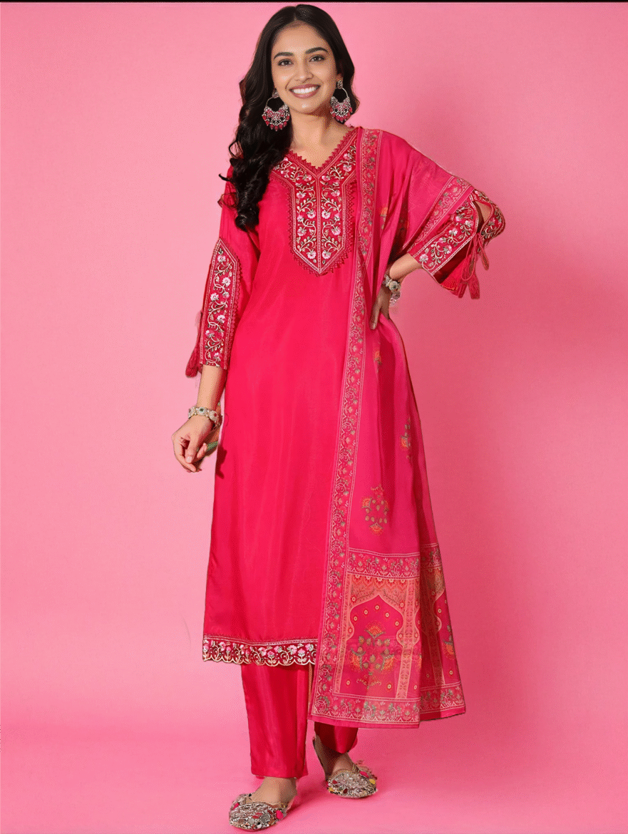 .Radiate festive charm in this bold pink suit set, crafted for elegance and vibrance. The kurta features intricate thread embroidery in white, gold, and pink along the neckline, front, sleeves, and hem, finished with tassel tie-up accents and a lace border. Its straight-cut silhouette with 3/4th sleeves ensures a flattering fit. Paired with matching trousers and a coordinated printed-embroidered dupatta, the ensemble exudes richness. Made from soft, breathable fabric with a subtle sheen, it’s perfect for celebrations and gatherings.